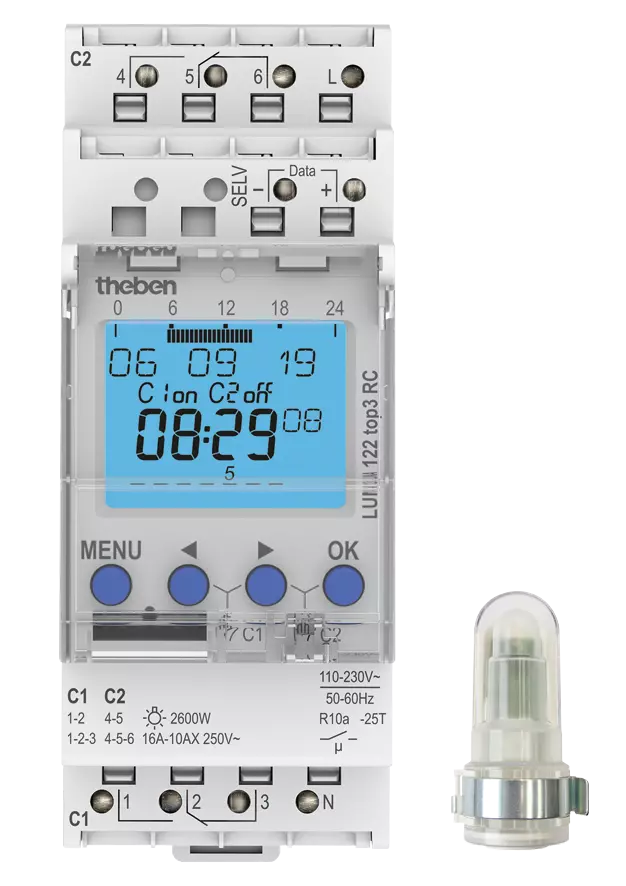 Theben Twilight switch with integrated weekly timer, surface-mounted light sensor, 2 channels LUNA 122 top3 AL